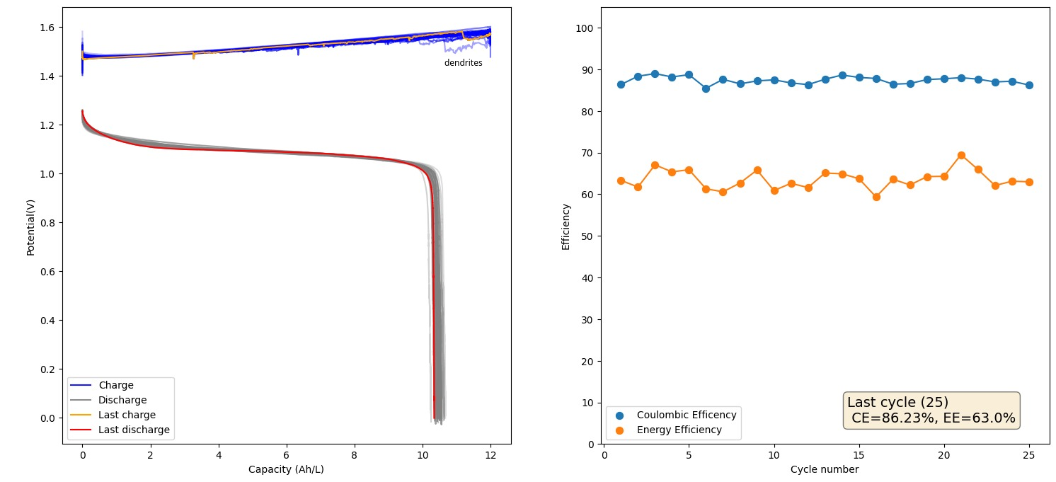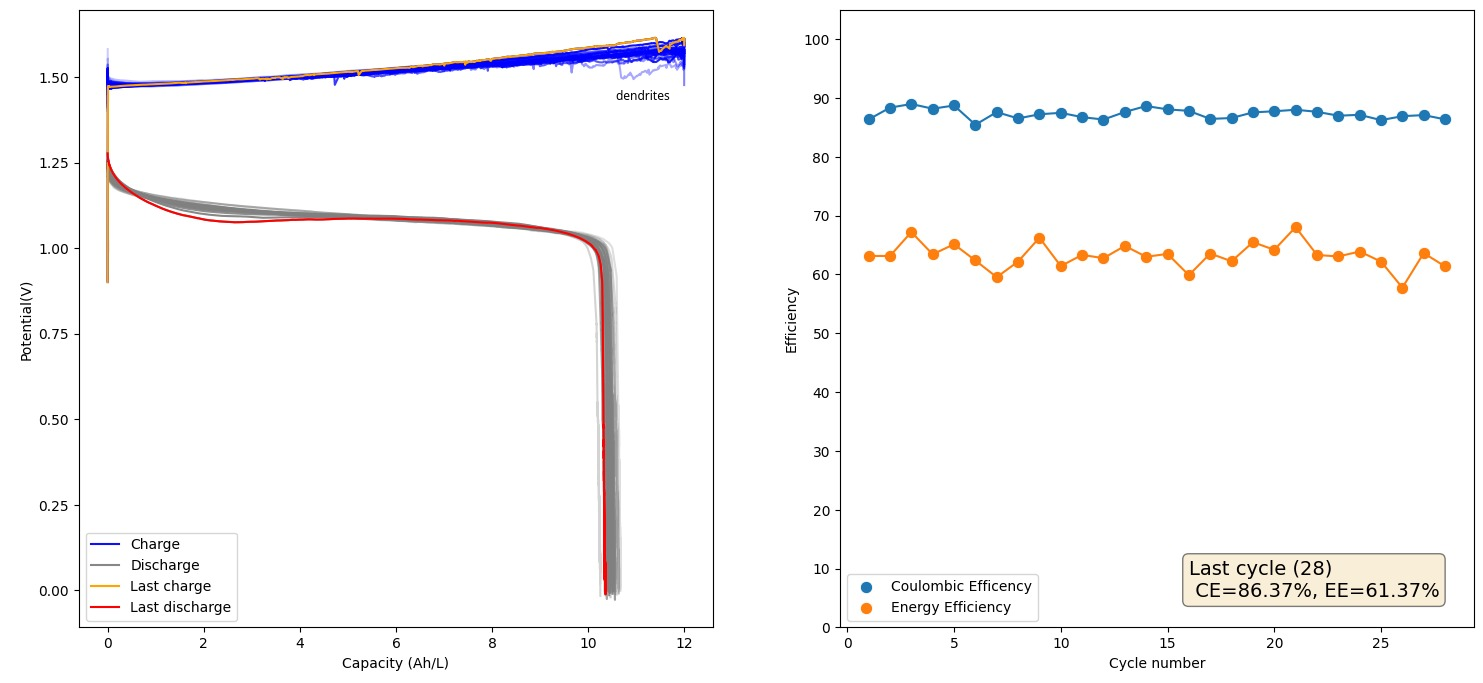 1 m \(\ce{ZnCl2}\), 2 m \(\ce{KI}\), \(\ce{KAc}\) buffer, 5 mL each side, photopaper separator, 30 mA/cm², 120 mAh/cm², same cell from last test, 6 days (11 total)