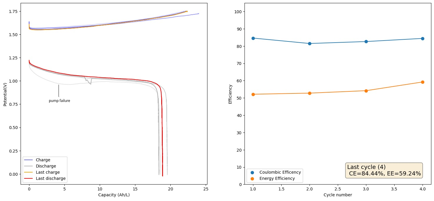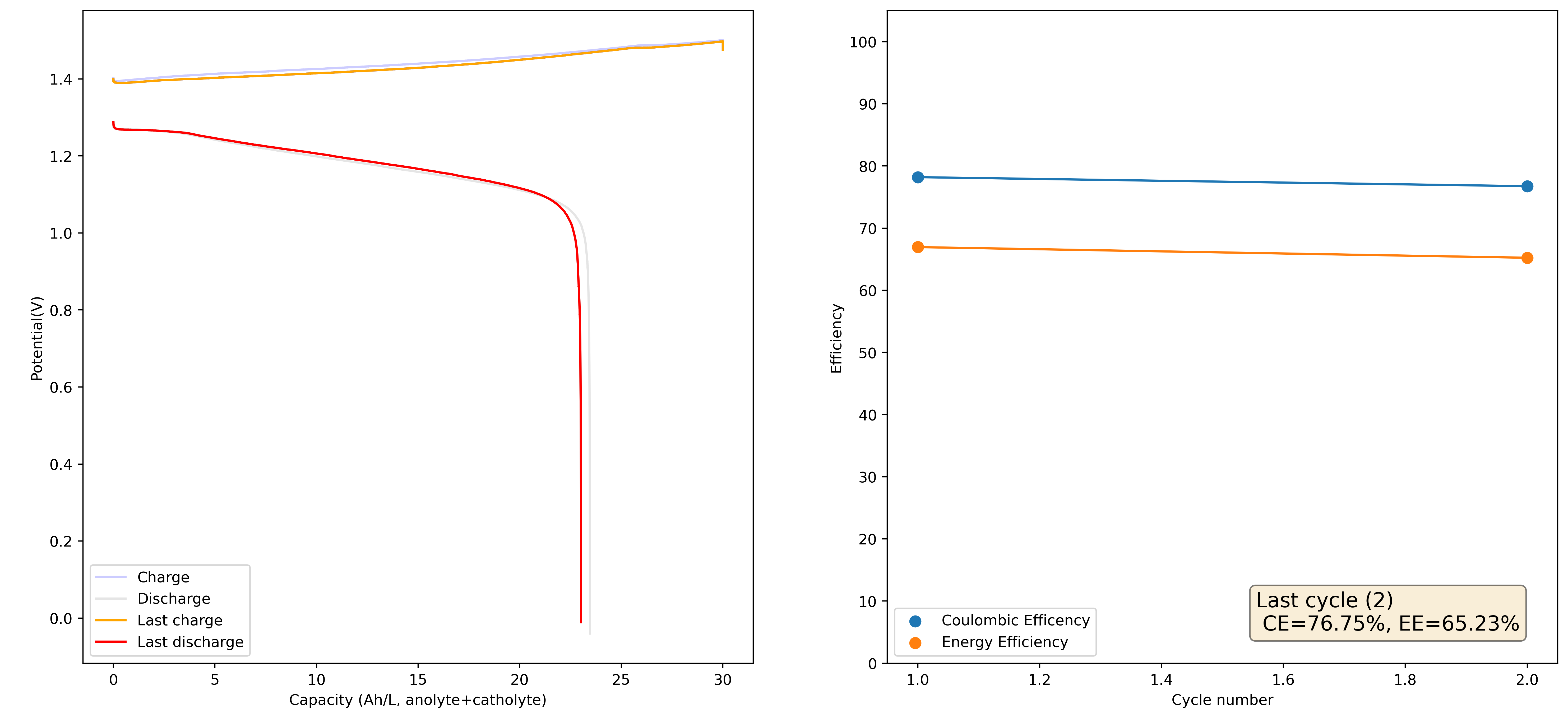 2 m \(\ce{ZnCl2}\), 4 m \(\ce{KI}\), \(\ce{KAc}\) buffer, 5 mL each side, photopaper separator, 30 mA/cm², 120 mAh/cm²